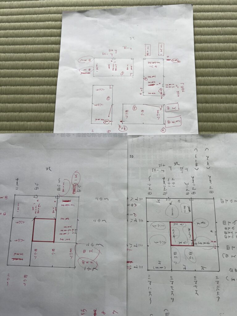 午前8時30分にお伺いし、既存の畳を搬出後、床下を清掃。採寸に細心の注意を払いながら、寸法紙を数枚作成して割り付けを行いました。