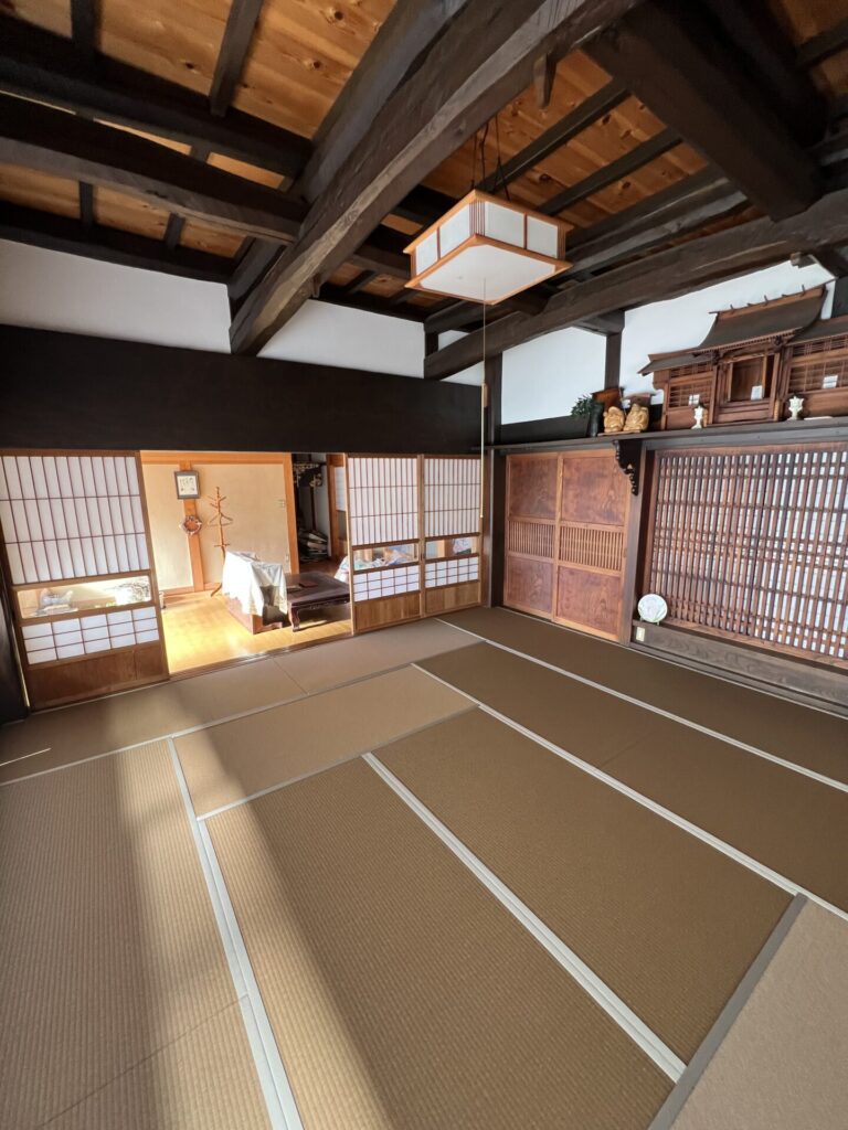 今回の現場は、築100年以上の歴史ある建物を現在の場所に移築したという、60坪を超える立派な平屋。大国柱や恵比寿柱が堂々と構え、太い梁が天井に渡る、まさに「日本の暮らしの原点」を思わせるお住まいです。