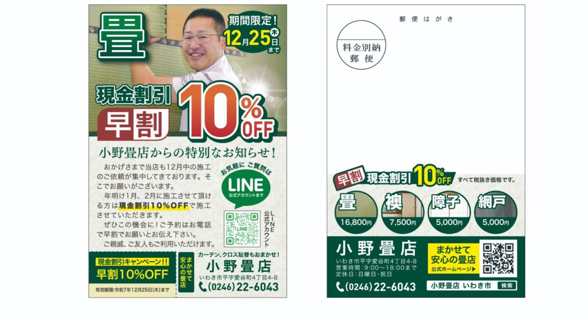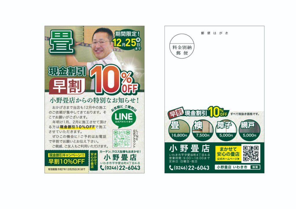 お申し込みは、お電話か小野畳店の公式LINEから受け付けています。 ハガキを受け取られた方は「早割ハガキを見た」とお伝えいただくとスムーズです。