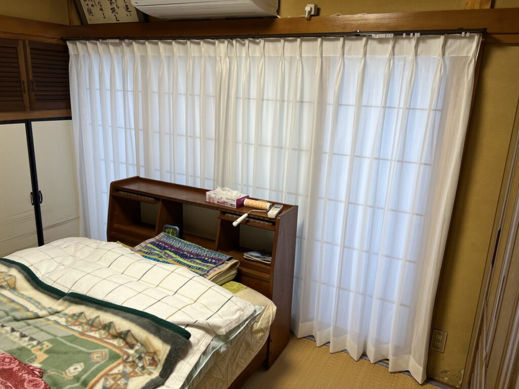 障子の内側にカーテンを付けたいとのことで、カーテンレールの取り付けから採寸まで、その場で対応させていただきました。