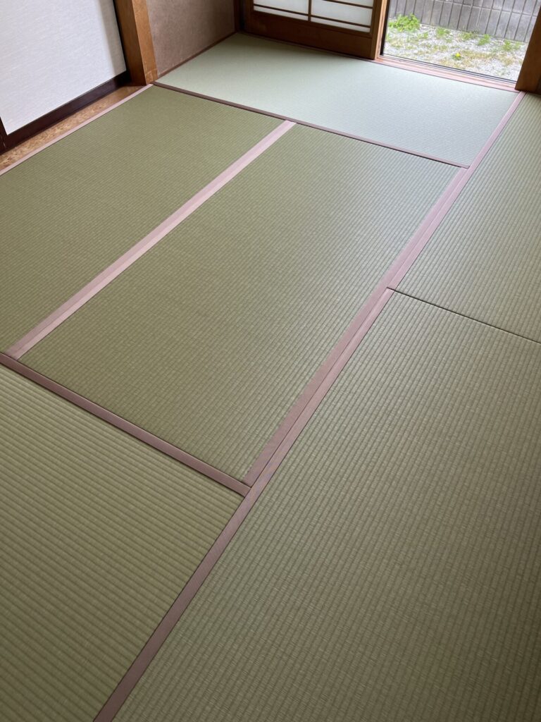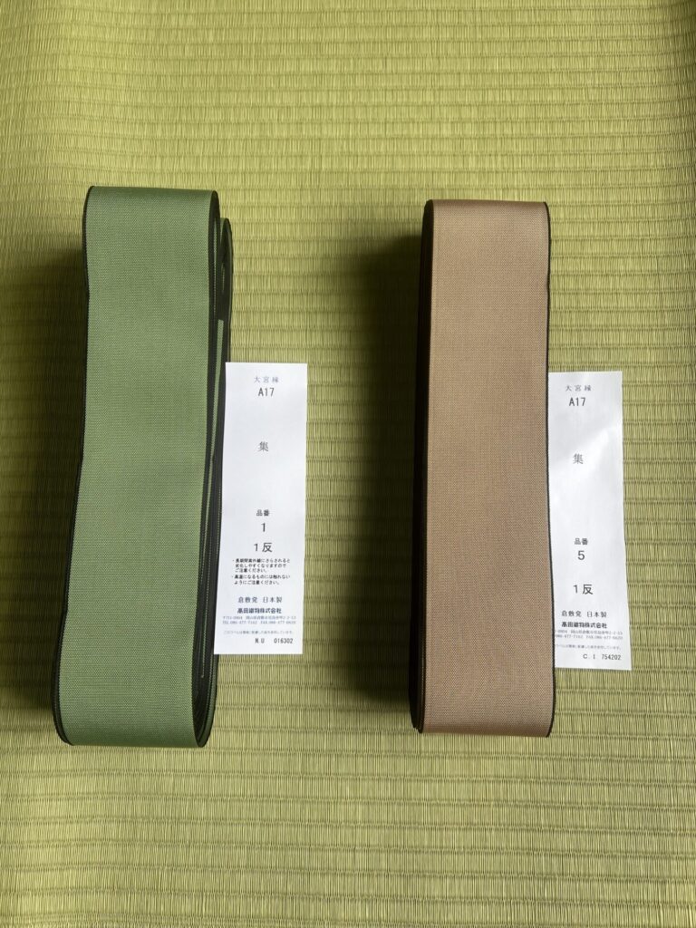 納品後、新しくなった畳をご覧になったお客様は、「こんなに綺麗なんだ、明るくなった!」ととても喜んでくださいました。2部屋それぞれ別の縁をお選びいただきましたが、結果として各部屋の壁の色ともよく合い、「どちらもお気に入り」とのお言葉をいただきました。