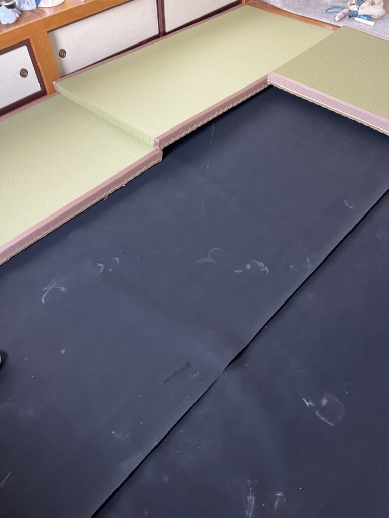 1階の部屋については「床下の湿気が少し心配」とのことでしたので、畳を剥がして床板の状態を直接確認しました。幸い乾燥していて異常は見当たりませんでしたが、より安心していただけるよう竹炭パワーシートを敷いたうえで新しい床畳を収めることにしました。目に見えない部分にも丁寧に対応することで、長く安心してお使いいただけます。